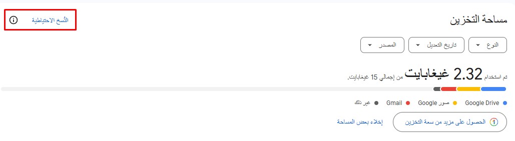 2. الآن قم بالضغط على (مساحة التخزين) الموجودة في الجانب الأيمن كما موضح في الصورة ثم قم بالضغط على (النُسخ الاحتياطية) الموجودة بالأعلى لكي يظهر أمامك كل النسخ الاحتياطية المتوفرة لديك.