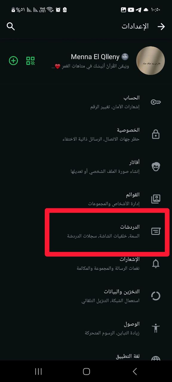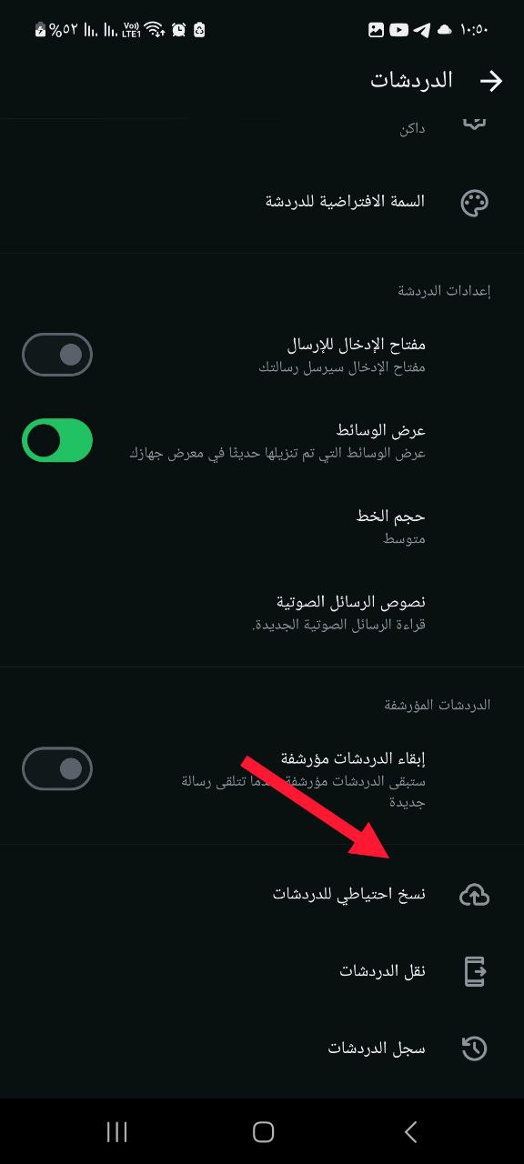 2. في هذه الخطوة اضغط على > الدردشات ثم اضغط على > نسخ احتياطي للدردشات.