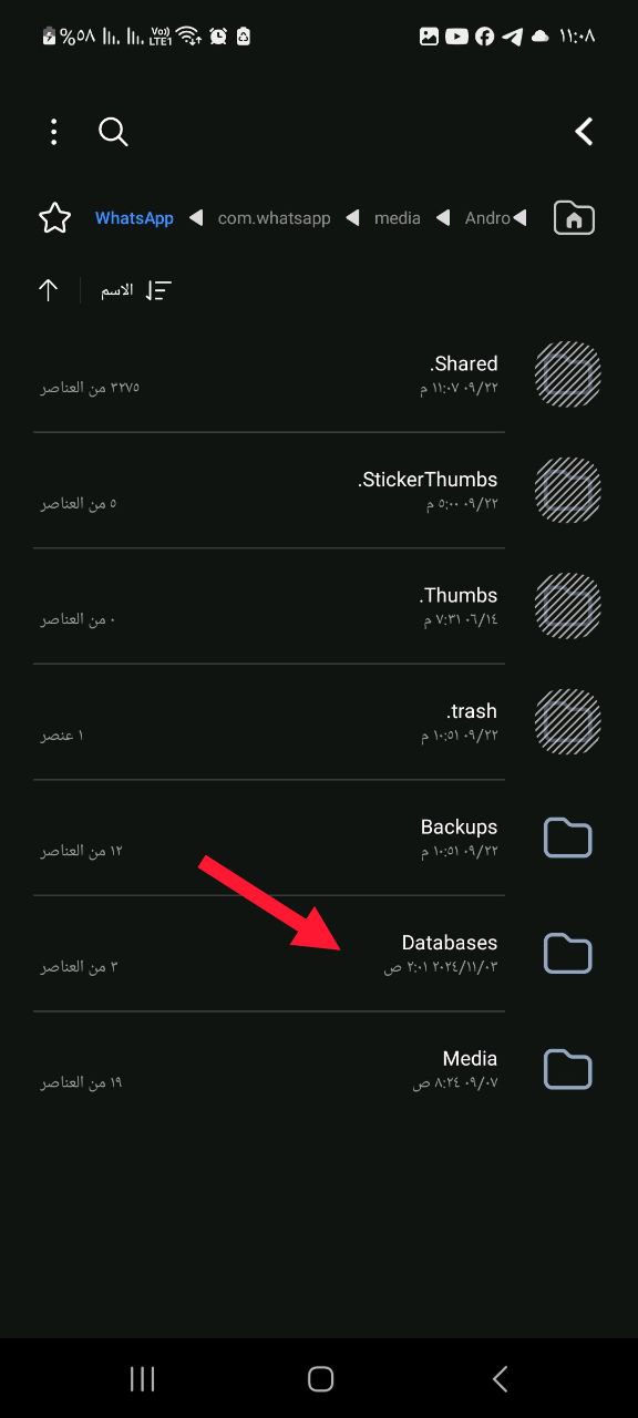 2. انتقل إلى (مكان التخزين الداخلي) للهاتف ثم إلى > Android ثم > Media ثم > com.whatsapp ثم إلى > whatsApp ثم أخيرًا إلى > Databases.
