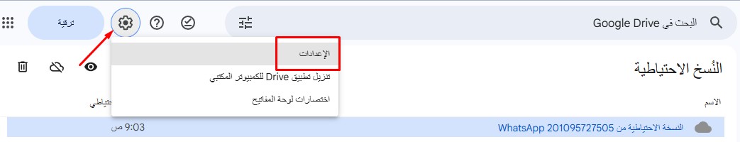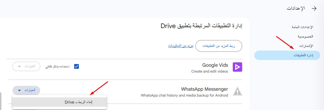 6. إذا كنت تريد إيقاف عملية النسخ الاحتياطي للواتساب على حساب جوجل درايف تستطيع الضغط على أيقونة الضبط الموجودة بالأعلى أو (الترس) ثم اختيار (الإعدادات) ثم بعد ذلك الذهاب إلى إدارة التطبيقات والذهاب إلى تطبيق الواتساب ثم الضغط على كلمة (الخيارات) بجانب التطبيق ثم بعد ذلك > إلغاء الربط بـ Drive.
