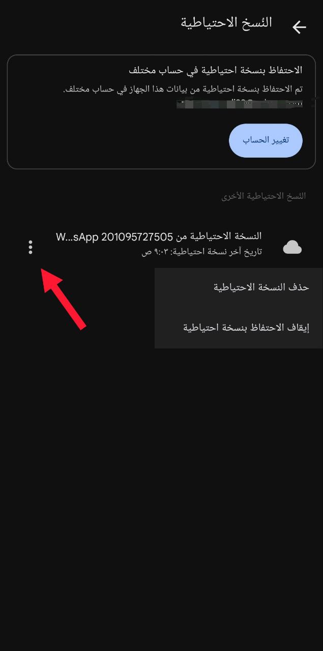 2. سيظهر لك الآن آخر نسخة احتياطية تم الاحتفاظ بها على حساب جوجل درايف، اضغط على الثلاث نقاط بجانبها واختر (حذف النسخة الاحتياطية أو  إيقاف الاحتفاظ بنسخة احتياطية).
