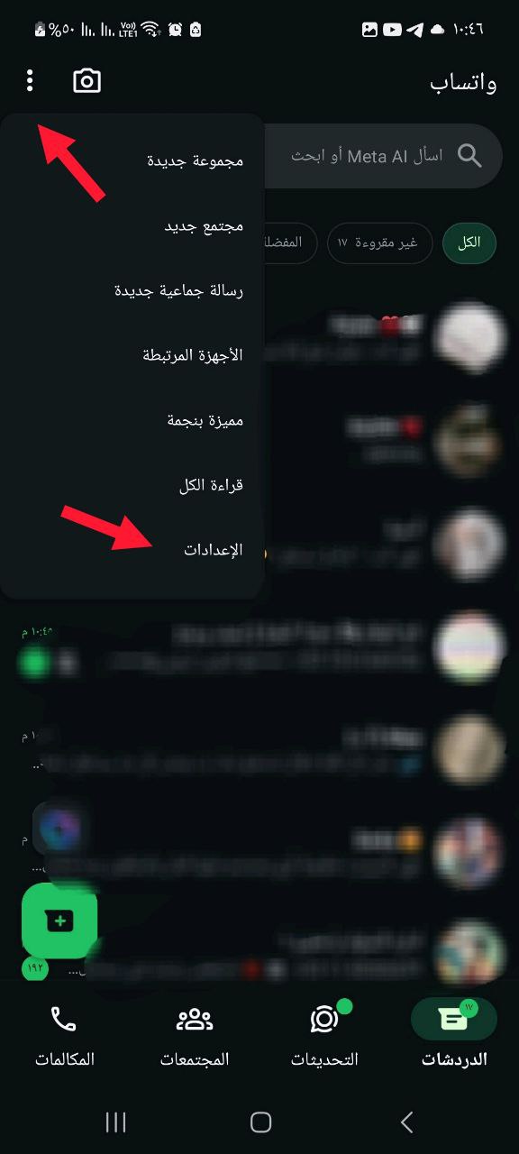 1. افتح تطبيق الواتساب ثم الضغط على الثلاث نقاط الموجودة بالأعلى ثم بعد ذلك الذهاب إلى > الإعدادات.