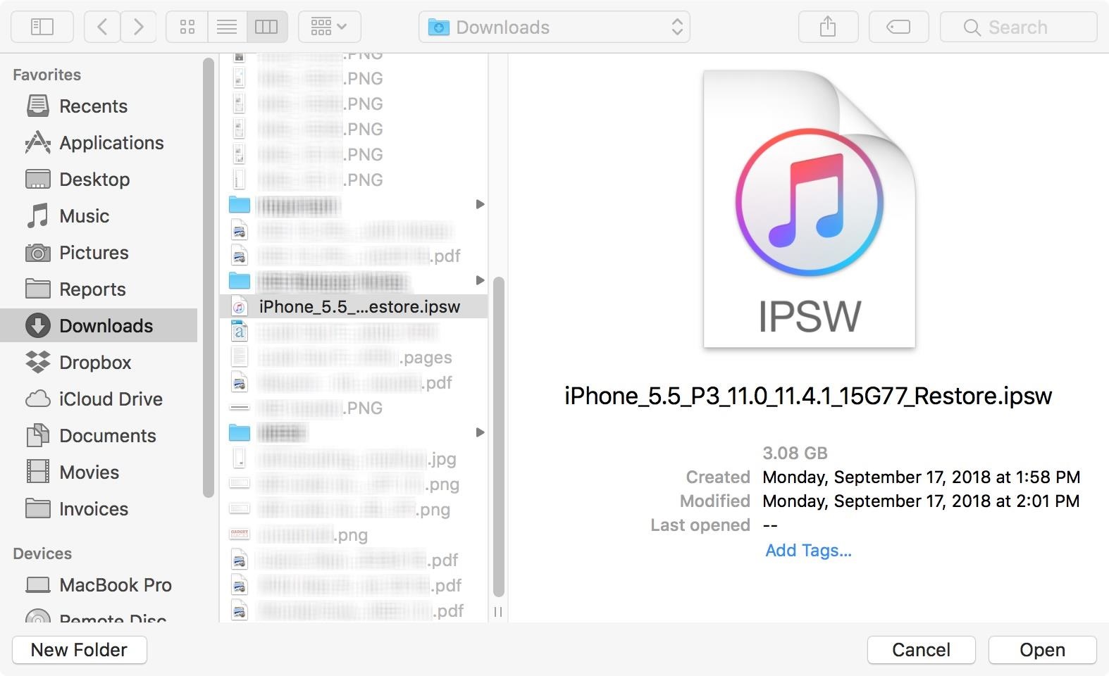 ستجد أن قائمة متصفح الملفات قد ظهرت، ومن هنا توجّه إلى ملف نظام IPSW الرسمي الذي قمت بتحميله في الخطوة الثانية بالأعلى. وبمجرد إختياره قم بالضغط على زر ‘Open’.