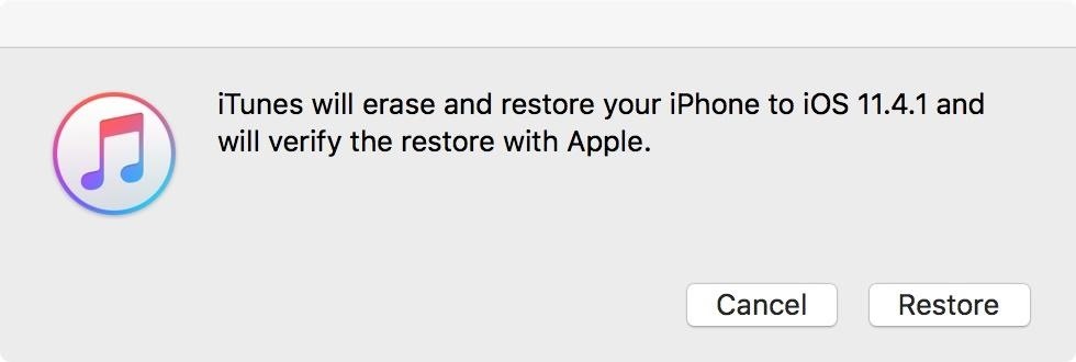 تاليًا، ستظهر نافذة أخرى في برنامج الايتونز تقوم بتنبيهك أنك على وشك تثبيت نظام iOS 11.4.1 على الجهاز المتصل بالكمبيوتر بدلًا من النظام الحالي ( بغض النظر عن إصدار النظام الحالي سواء كان iOS 12 أو أعلى أو حتى أقل).