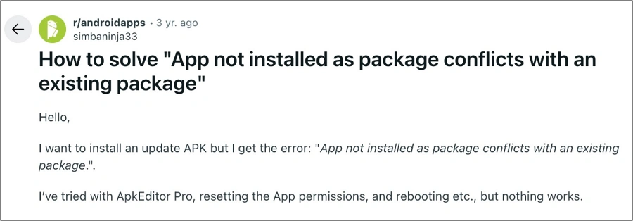 حل المشكلة يبدو سهلًا بشكل كافي، ولكن المشكلة الحقيقية أن نظام الأندرويد في معظم الأحيان لا يتخلّص نهائيًا بجميع الملفات الخاصة بتطبيقٍ ما قمت بإزالته؛ وبالتالي عند محاولتك لتثبيت التطبيق الجديد مرة أخرى ربما تواجه نفس الرسالة.