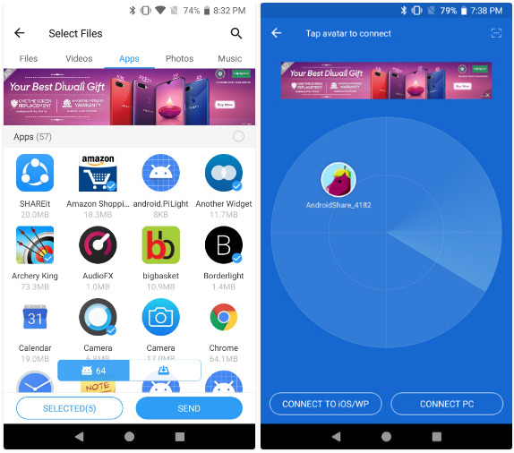 إذا ما صادف أنك تريد مشاركة شيء ما مع أصدقائك سواء كان فيلم اجنبي ذو حجم كبير أو إرسال عدد كبير من الصور في نفس الوقت أو حتى إمكانية إرسال تطبيق APK من هاتفك لآخر، النقل باستخدام واي-فاي هو الحل الأفضل هنا. وكلمة واي-فاي هنا تعني عبر اتصال Wi-Fi وذلك لأنك إذا أردت إرسال ملف سعته 200 ميجابايت مثلا، ستقضي اليوم بكامله إذا قمت باستخدام البلوتوث! لذلك سيكون تطبيق SHAREit هنا هو الحل الأمثل لفعل ذلك.
