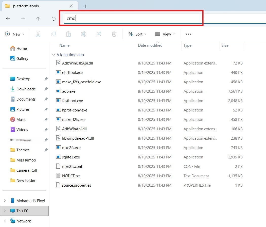 الخطوة الرابعة: بداخل مجلد Platfotm-tools اكتب بالأعلى في خانة العنوان كلمة: cmd واضغط Enter؛ لتظهر أمامك نافذة الأوامر.