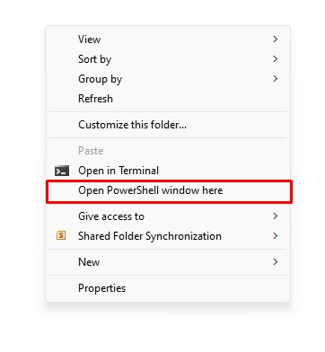 - في أي مساحة فارغة بمجلد platform-tools – عبر لوحة المفاتيح (الكيبورد) قم بالضغط مطولًا على زر SHIFT وأثناء ذلك قمت بالنقر أيضًا على زر الفأرة الأيمن (كليك يمين) ثم قم باختيار عبارة ‘Open PowerShell window here’.