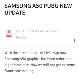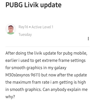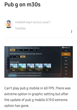 ظهرت الكثير من التقارير من مستخدمي اجهزة Galaxy A وأيضًا Galaxy M من سامسونج في منتديات الدعم الرسمية للشركة الكورية وبإمكانك إيجادها هنا: (1, 2, 3, 4, 5, 6, 7, 8, 9) وجميعهم يشكون من شئ واحد ألا وهو أن إعداد جرافيك “إكستريم” في لعبة ببجي قد اختفى بعد التحديث! وبعد تثبيت إصدار PUBG 0.19.0 LIVIK قد وجدوا أيضًا أنهم لم يستطيعون تشغيل اللعبة على إعداد 60fps (عدد إطارات 60 في الثانية) لأنه قد اختفى أيضًا!